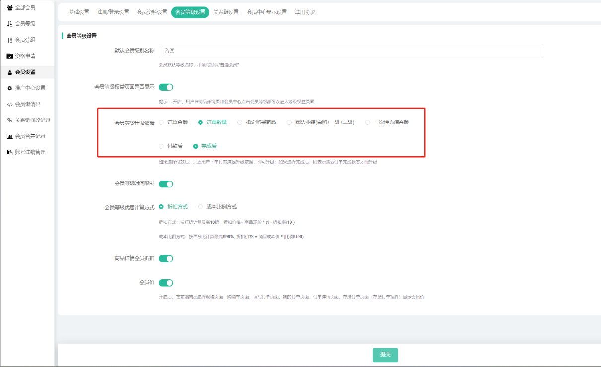 依据包括:订单金额、订单数量、购买指定商品自动升级、团队业绩(自购+一级+二级)、一次性充值余额等方式等。比如选择依据为订单金额,则会员等级条件设置为会员消费订单金额满XXX元后升级到该等级。订单升级依据支持选择订单付款后、完成后进行统计。