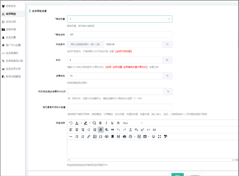给某一等级会员的减价奖励优惠(值为空代表不设置折扣/减免运费)。用于会员专属促销活动。折扣运费减免可在前端会员等级权益页面显示,如下图