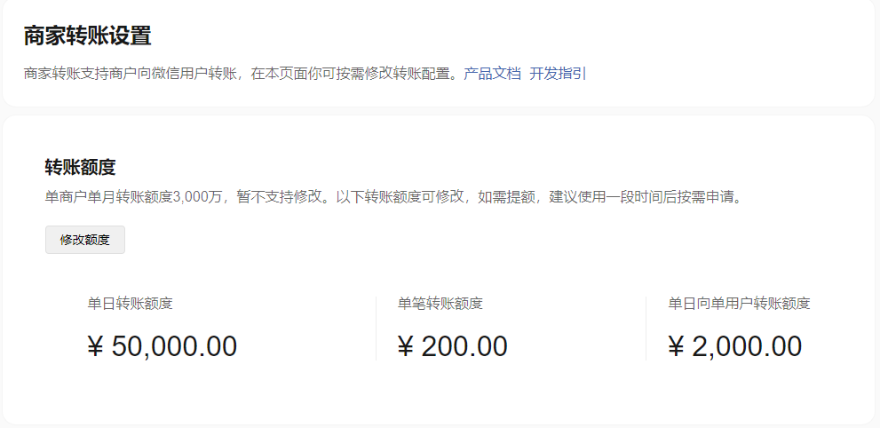 如有提额需求请在开通后按需申请(商户平台>产品中心>运营工具 > 商家转账 > 前往功能)。提额结果将根据商户号历史使用情况和提额审核结果确定,建议使用一段时间后再申请提高,详细可参考附录设置转账额度文档。