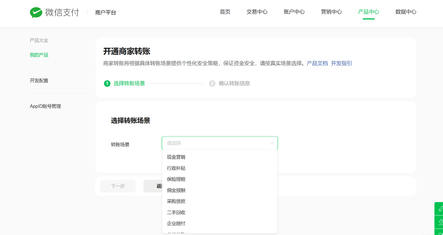 请前往微信支付商户平台> 产品中心 > 运营工具 > 商家转账 > 申请开通,按页面指引完成开通